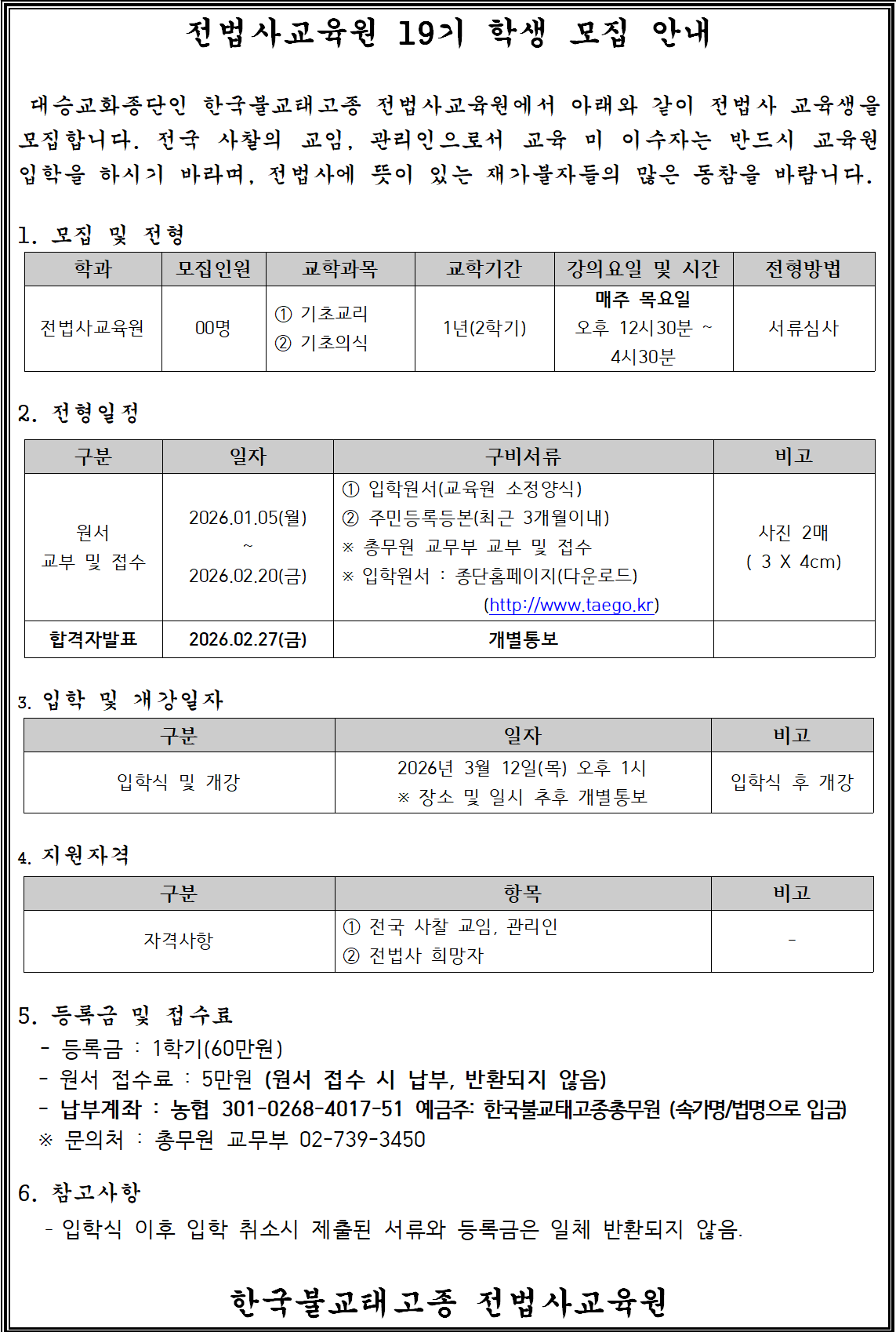 전법사교육원 19기 학생 모집 안내 한국불교태고종 0 4시간전 2025.12.27 13:53 2026 전법사 입학안내.hwp (80.0K) + 0 2025.12.27 13:49 2026 전법사교육원_입학원서.hwp (37.5K) + 0