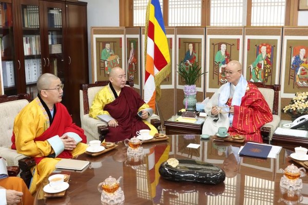 한국불교태고종 총무원장 상진 스님은 4월 27일 오후 2시 한국불교전통문화전승관 2층 총무원장 집무실에서 몽골불교종단협의회 간단사 스님들의 예방을 받고 양국 불교교류를 주제로 차담을 가졌다.