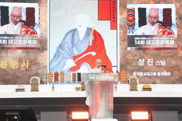 총무원장 상진 스님은 봉행사에서 “오늘 이 자리는 단순한 불교행사가 아니라 한국불교의 전통과 현대문화를 하나로 아우르는 원융의 축제다”면서 “부처님의 가르침이 예술과 음악, 그리고 문화로 피어나는 이 무대는 우리 사회가 서로의 다름을 이해하고 함께 조화를 이루는 통합의 상징이 될 것이다”고 밝혔다. 총무원장 상진 스님은 이어 “이번 제14회 태고문화축제를 통해 전국의 불자와 국민이 함께 어우러져 부처님의 자비와 평화의 가르침을 되새기고, 나아가 서로를 포용하고 존중하는 대화합의 장이 되기를 기원한다”고 말했다.