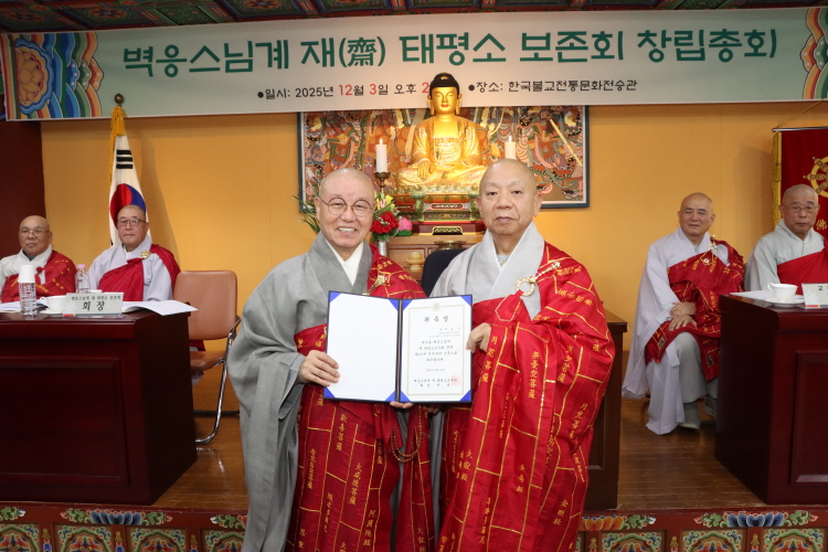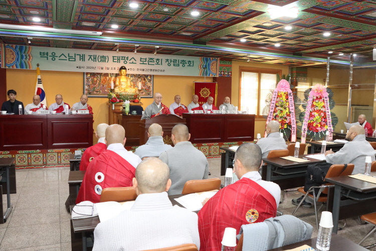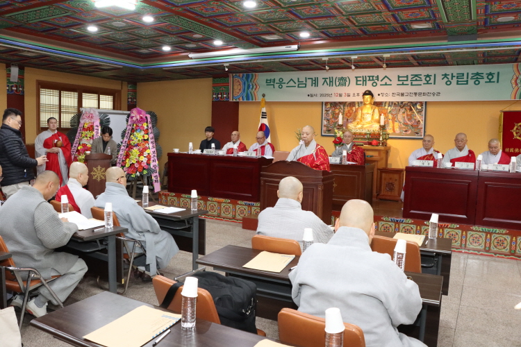 12월 3일 오후 2시 총무원장 상진 스님은 한국불교전통문화전승관 1층 회의실에서 총무원 부설 ‘벽응 스님계 재(齋) 태평소보존회 창립총회를 개최했다. 이날 창립총회에는 총무원장 상진 스님을 비롯해 태평소보존회 초대회장으로 선출된 불교문예원장 지허 스님, 영산재 전승 교육사 일운 스님, 영산재보존회장 현성 스님, 교육원장 재홍 스님 등과 보존회원 스님 등이 참석했다. 보존회장 지허 스님은 “1993년 신촌 봉원사에서 호적(胡笛, 태평소) 특강이 열렸고, 벽응 스님에게 가르침을 받았다. 당시 스님께서는 ‘자네만 알지 말고 후학들에게 반드시 전하라’고 말씀하셨고 이를 잊은 바 없다”면서 “그럼에도 벽응 스님의 소중한 불교 가락이 사라질 위기여서 안타까웠는데 보존회가 발족하게 돼 감개무량하다”고 소감을 전했다.