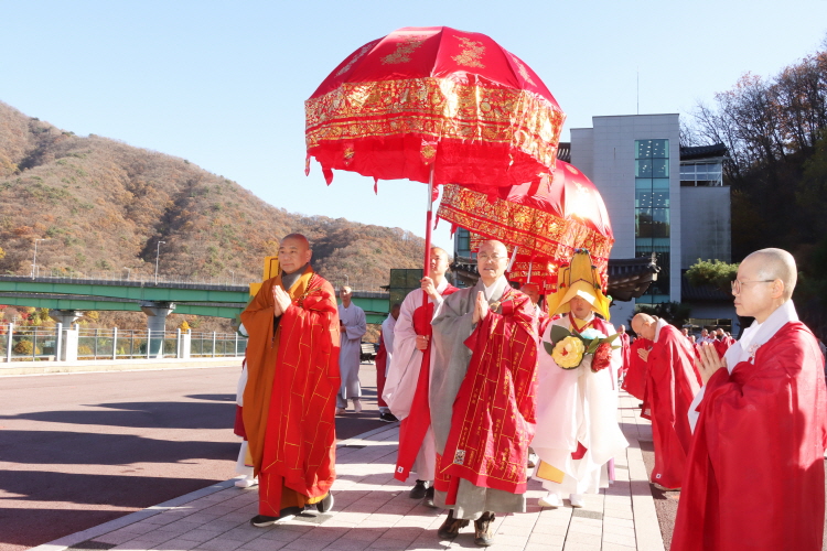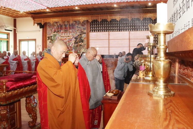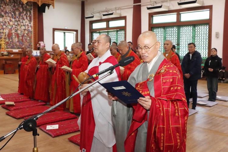 한국불교태고종 총무원장 상진 스님은 11월 10일 오후 2시 양주 청련사에서 중국 절강성 후저우시 불교협회(회장 계륭 스님) 대표단의 예방을 받고 환담을 나눴다. 후저우시 불교협회 대표단은 11월 12일 서울 국회의사당 국회박물관에서 태고종이 주최하는 ‘제8회 한중불교문화교류 학술세미나’ 참석을 위해 방문했다. 이번 방문에서 후저우시 불교협회 대표단은 회장 계륭 스님을 비롯해 30여 명이 동행한 가운데 청련사 대적광전에서 양국 합동 예불을 봉행했다.